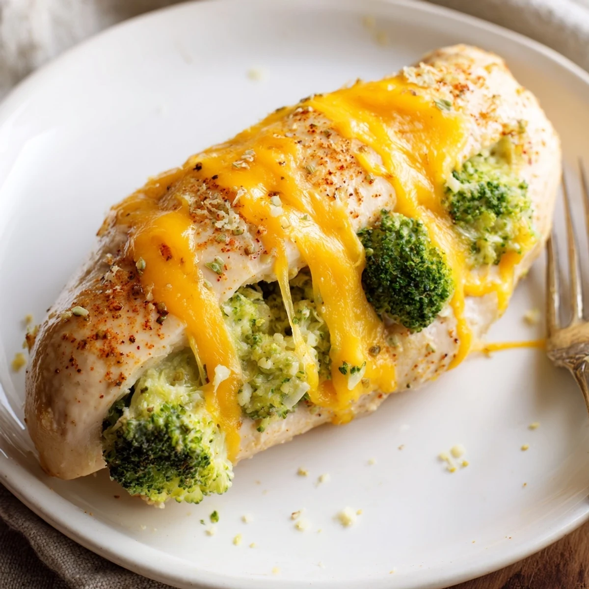 Cut pockets into boneless chicken breasts, rub with olive oil and a spice mix, then stuff with finely chopped broccoli, cheddar, cream cheese, Parmesan, Dijon and garlic. Secure with toothpicks, place on a lined sheet and bake at 400°F (200°C) for 25–30 minutes until internal temp reaches 165°F (74°C). Rest 5 minutes. For extra flavor fold in cooked bacon or swap cheddar for mozzarella or Swiss.