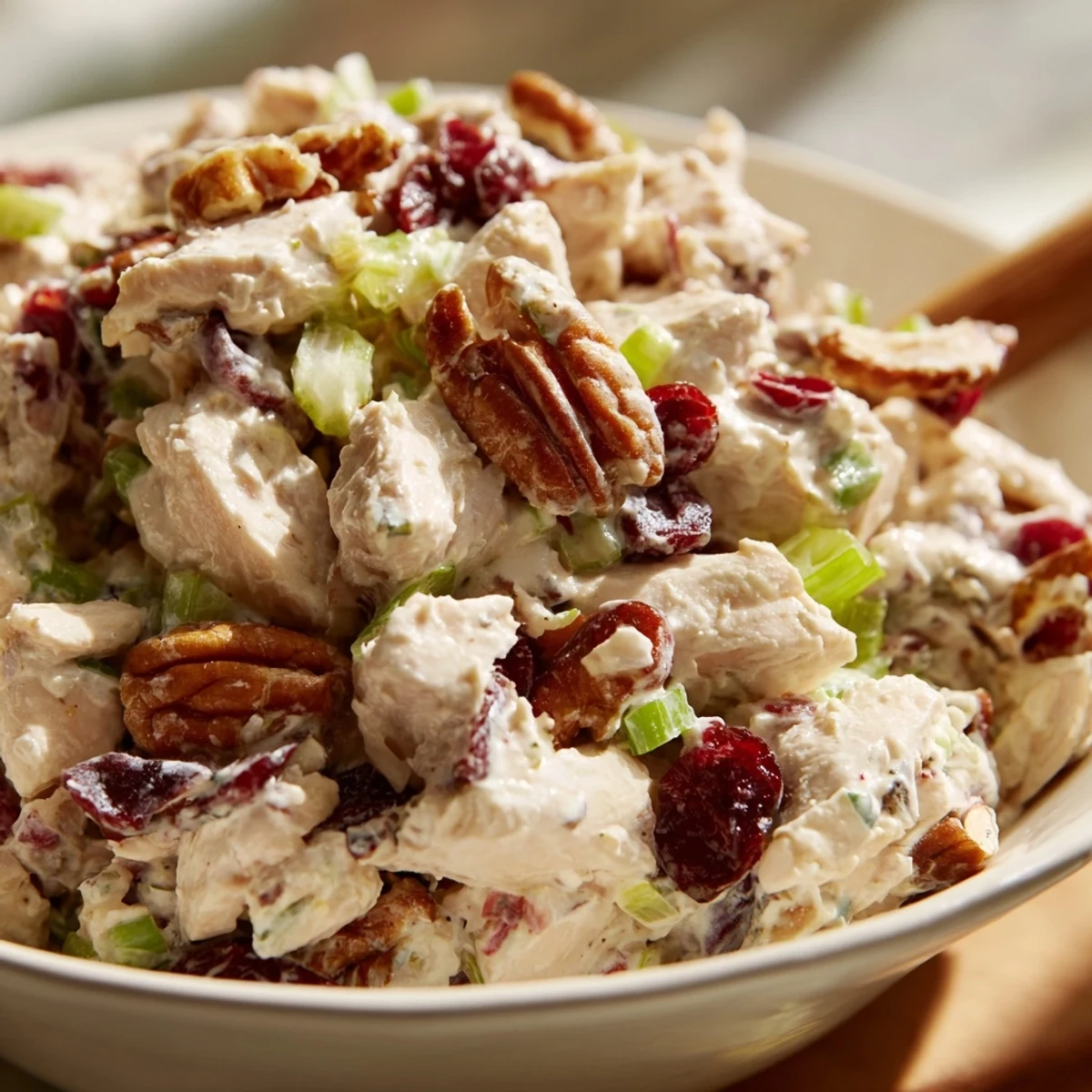 This creamy chicken salad combines tender diced chicken with sweet dried cranberries and crunchy toasted pecans. The dressing blends mayonnaise with Greek yogurt for a lighter, tangier finish, brightened by fresh lemon juice and Dijon mustard. Quick to prepare and endlessly versatile, it serves beautifully on croissants, in lettuce cups, or atop mixed greens. The flavors develop wonderfully after chilling, making it perfect for meal prep or casual gatherings.