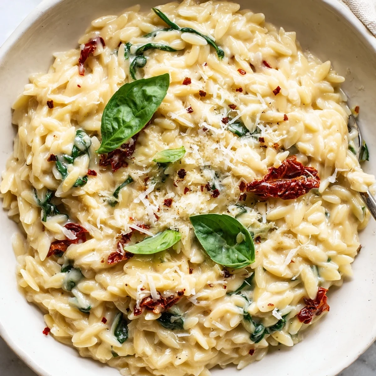 This satisfying one-skillet pasta dish brings the warmth of Tuscan cooking to your table in just 30 minutes. Tender orzo cooks directly in vegetable broth with sun-dried tomatoes, absorbing rich flavors as it simmers. Heavy cream and freshly grated Parmesan create a velvety sauce that coats every bite, while baby spinach adds freshness and color.
