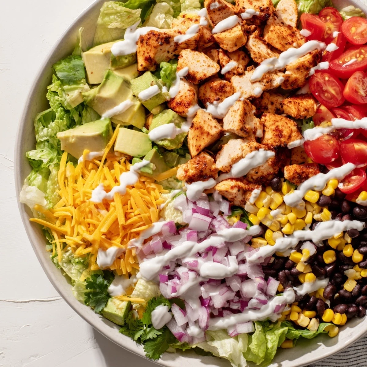 This vibrant chopped salad combines tender grilled BBQ chicken breast with crisp romaine lettuce, cherry tomatoes, black beans, sweet corn, bell pepper, red onion, and creamy avocado. The tangy homemade dressing blends Greek yogurt with barbecue sauce, lime juice, and honey for a perfect balance of flavors. Ready in just 35 minutes, this high-protein main dish serves four and can be easily customized with your favorite vegetables or made vegetarian with grilled tofu.