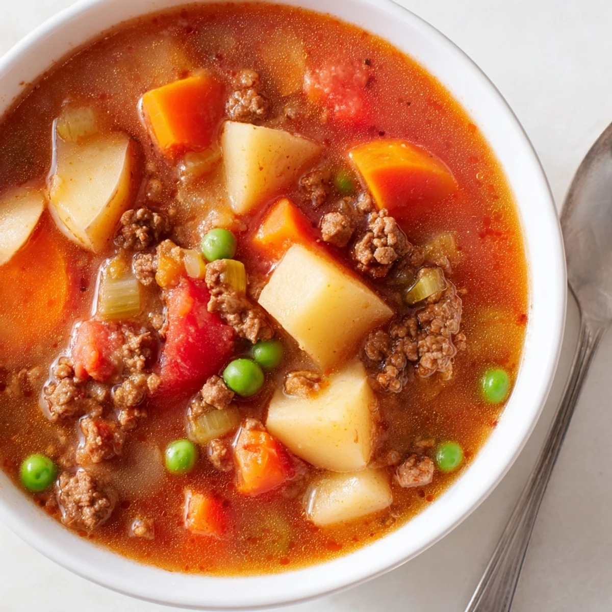 This filling soup combines browned ground beef with diced russet potatoes, carrots, celery, and onions in a seasoned beef broth base. The addition of diced tomatoes and frozen peas adds depth and sweetness, while smoked paprika and dried thyme provide aromatic flavor. Ready in under an hour, this soup makes a complete meal when served with crusty bread.