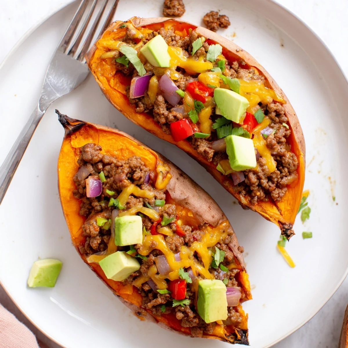 Preheat oven to 200°C (400°F) and roast whole sweet potatoes 40–45 minutes until fork-tender. While they bake, sauté onion and bell pepper, brown ground beef 5–7 minutes, then stir in tomato paste, smoked paprika, cumin and chili powder. Drizzle hot honey and simmer briefly. Split potatoes, fluff the flesh, fill with the glazed beef and top with cheese, cilantro and avocado. Finish under the oven briefly to melt cheese if desired; swap turkey or skip cheese for a leaner or dairy-free option.