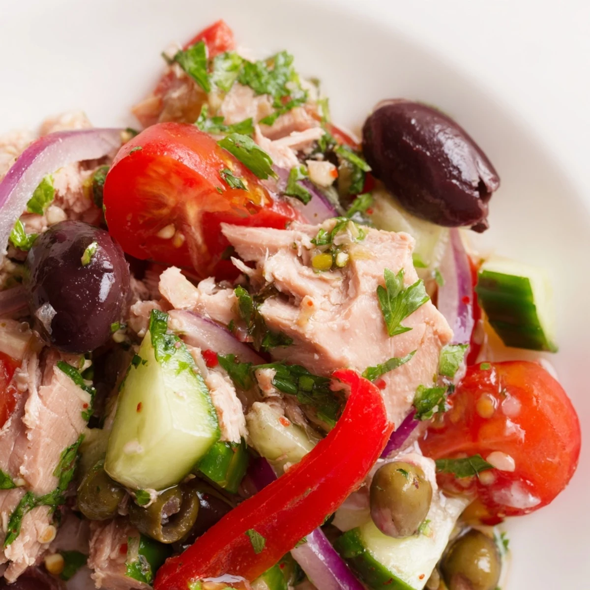 This vibrant Mediterranean-inspired dish combines tender tuna in olive oil with crisp cherry tomatoes, refreshing cucumber, sharp red onion, and sweet roasted red peppers. Kalamata olives and briny capers add depth, while a bright lemon-olive oil dressing with garlic and oregano ties everything together.