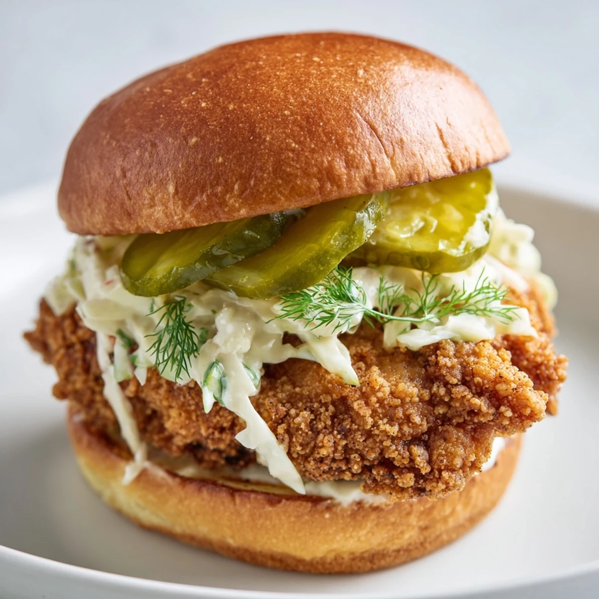 These Southern fried chicken burgers feature juicy chicken thighs marinated in seasoned buttermilk, coated in a crispy spice blend, and fried until golden. The tangy cabbage slaw adds crunch and brightness, while dill pickles provide the perfect acidic balance. Toasted buns hold everything together for this comforting classic.
