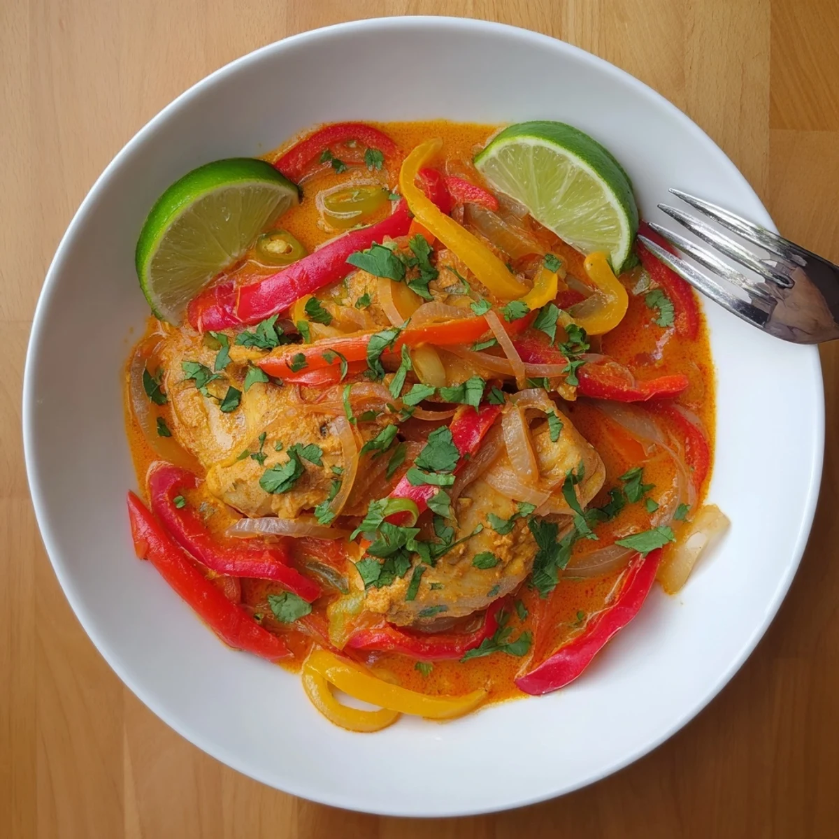 Succulent chicken thighs marinated in lime, garlic, and aromatic spices, then seared to golden perfection. Simmered slowly in full-fat coconut milk with sweet bell peppers, onions, and tomatoes, creating a luscious, velvety sauce that balances creaminess with gentle heat. Fresh cilantro and lime wedges add bright finishing touches to this comforting Brazilian-inspired creation.
