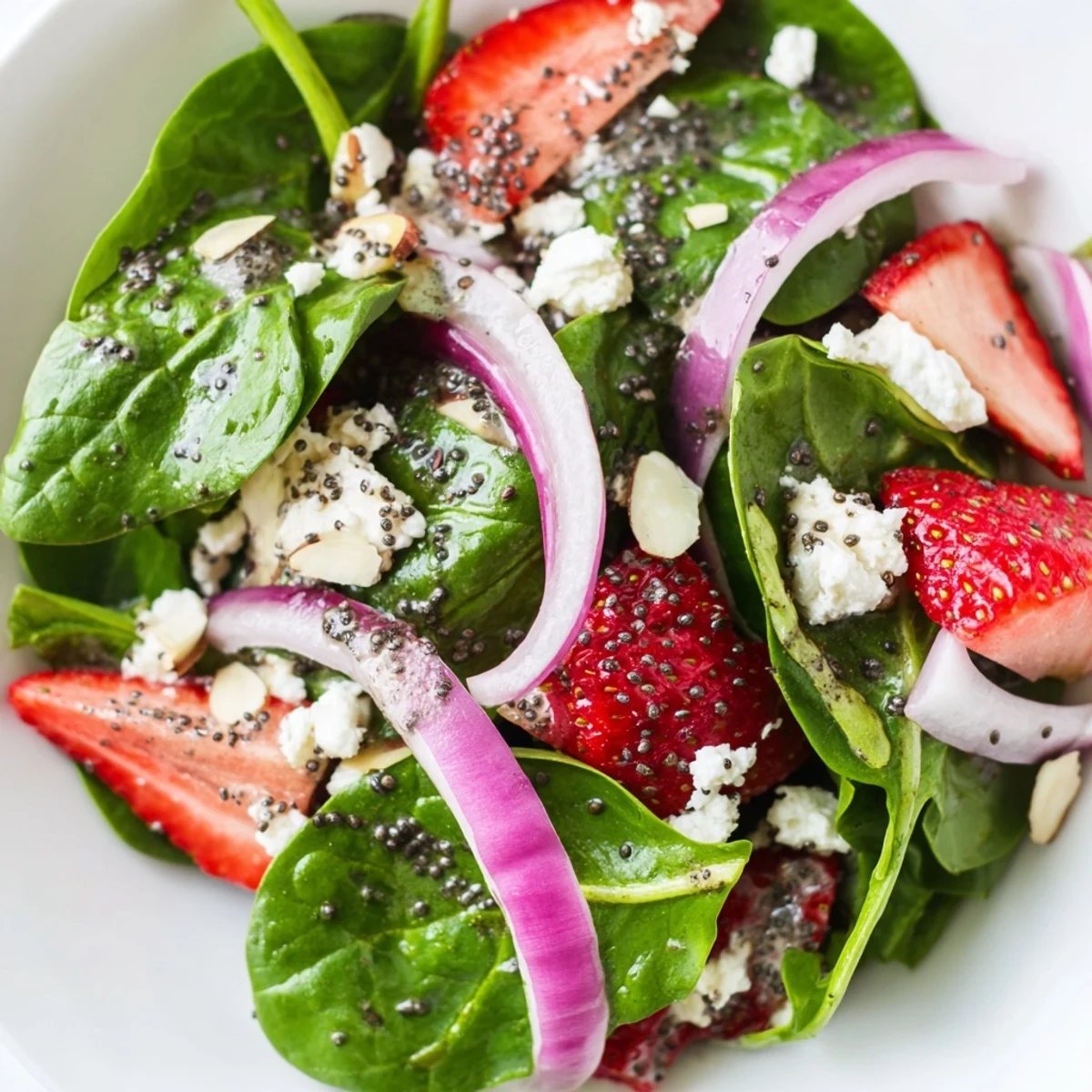 This vibrant salad brings together sweet strawberries, tender baby spinach, and crunchy toasted almonds for a perfect balance of flavors and textures. The homemade balsamic poppy seed dressing adds a tangy finish that ties everything together beautifully.