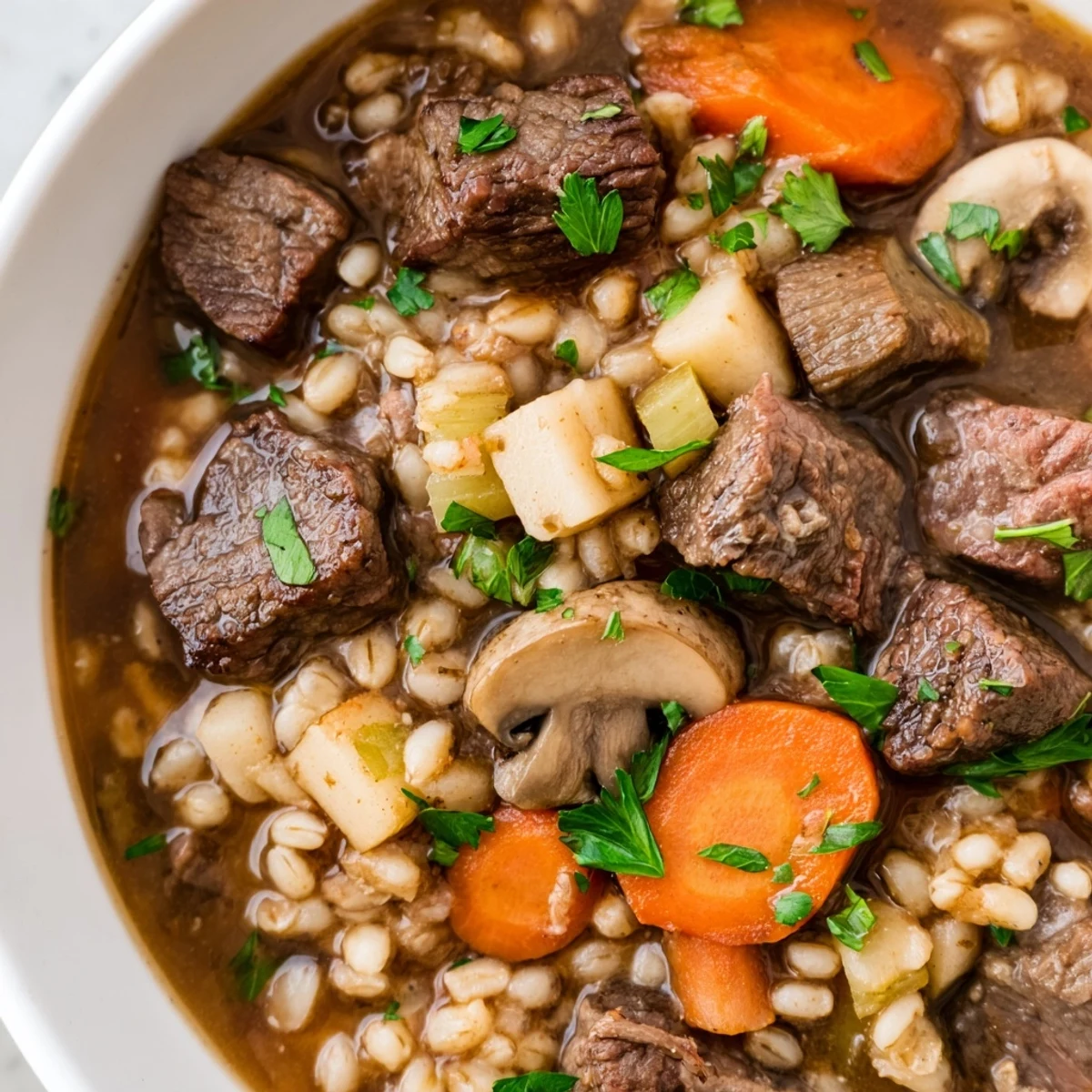 This rich stew brings together tender beef chuck, earthy pearl barley, and sweet parsnips simmered slowly with carrots, celery, mushrooms, and tomato for deep, satisfying flavor. Aromatic herbs like thyme and rosemary enhance the savory broth, which is gently cooked for hours. Ideal for cozy dinners, the dish offers warmth and hearty texture, garnished with fresh parsley for a bright finish. Optional red wine or vegetable substitutions add versatility.
